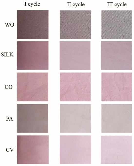 Fabric appearance after different dyeing cycles using aronia pomace extract (WO—wool, SILK—silk, CO—cotton, PA—polyamide, CV—viscose, I cycle—first dyeing cycle, II cycle—second dyeing cycle, and III cycle—third dyeing cycle).