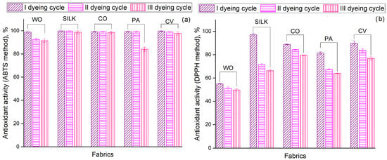 Antioxidant activity of fabrics determined according to: (a) ABTS method and (b) DPPH method. All data are expressed as mean values of triplicate measurements (n = 3), error bars represent standard deviations.
