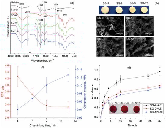 (a) ATR-FTIR spectra of gelatin, starch, and synthesized hydrogels, (b) visual appearance and microstructure of the lyophilized hydrogels, (c) equilibrium swelling ratio (ESR) and compression modulus of hydrogels, and (d) visual appearance and kinetic of release extract’s bioactive compounds from functionalized hydrogels (SG-X—starch/gelatin hydrogels, where X represents the crosslinking time (5, 7, 9, or 12 min), SG-X+AE—starch/gelatin hydrogels functionalized with aronia pomace extract). The data are expressed as mean values of four parallel measurements (n = 4) ± standard deviation.