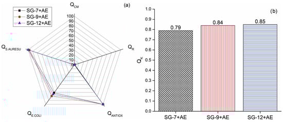 The final stage in evaluating functionalized hydrogels for wound dressing applications involved testing their overall quality (Supplementary Material). The dimensionless indicators for compression modulus (QCM), bioactive compounds release (QR), antioxidant activity (QANTIOX), and antimicrobial effect against Escherichia coli (QE.COLI) and Staphylococcus aureus (QS.AUREUS) were used for the assessment of hydrogels’ suitability for wound dressings. These indicators were then used to calculate the complex criterion of hydrogel quality (QK). The histogram presented in Figure 5b discloses that SG-7+AE, SG-9+AE, and SG-12+AE have excellent quality, with QK values of 0.79, 0.84, and 0.85, respectively.