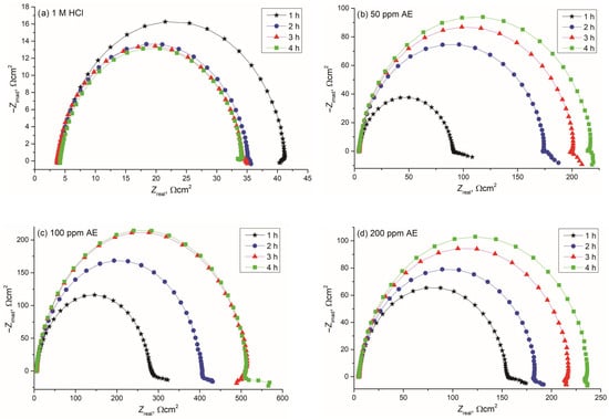 Nyquist diagrams (dependence of imaginary, −Zimag, on the real impedance component, Zreal) for carbon steel during 1–4 h of immersion in 1 M HCl solution containing: (a) 0 ppm, (b) 50 ppm, (c) 100 ppm, and (d) 200 ppm of AE (aronia pomace extract). The data are expressed as mean values of four parallel measurements (n = 3).