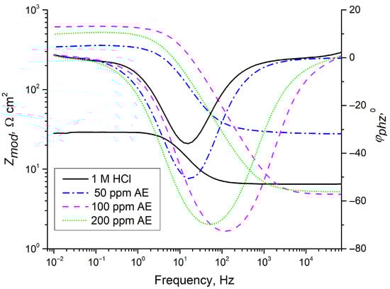 Bode diagrams (dependence of impedance modulus, Zmod, and phase angle, φ, on the frequency) for carbon steel after 24 h of immersion in 1 M HCl with different concentrations of AE (aronia pomace extract). The data are expressed as mean values of four parallel measurements (n = 3).