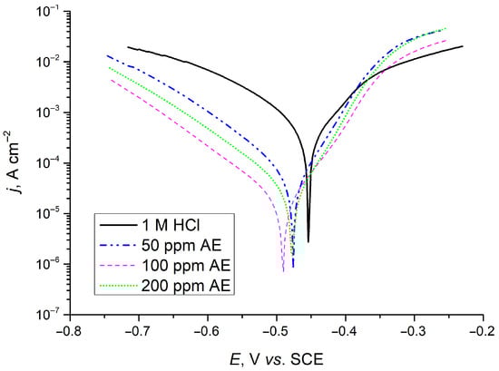 Polarization plots for carbon steel after 24 h of immersion in inhibitor-free solution (1 M HCl) and 1 M HCl solution containing 50, 100 or 200 ppm of AE (aronia pomace extract). The data are expressed as mean values of three parallel measurements (n = 3).