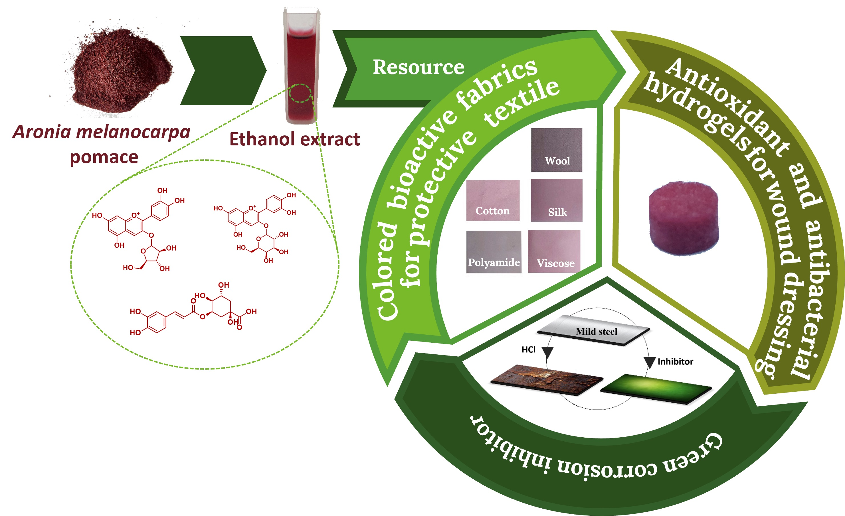Ugrinović, V.; Simović, A.; Ćorović, M.; Mihajlovski, K.; Lađarević, J.; Bajat, J.; Ivanovska, A. Valorization of Aronia melanocarpa Pomace: A Sustainable Source of Bioactive Compounds for Developing Colored Healthcare Textiles, Biomedical Hydrogels, and Green Corrosion Inhibitor. Sustain. Chem. 2025, 6, 46. https://doi.org/10.3390/suschem6040046