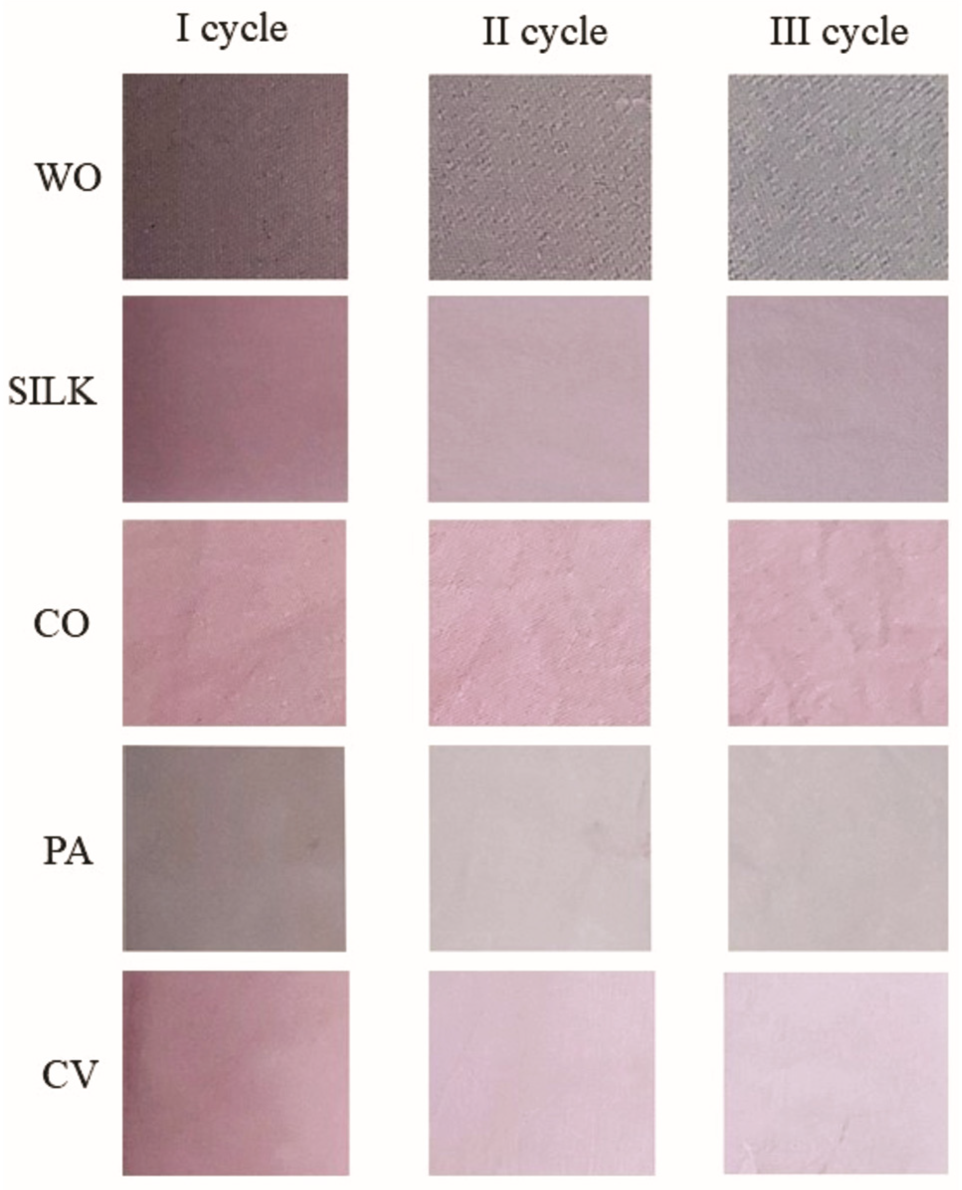 | Fabric | I Dyeing Cycle | II Dyeing Cycle | III Dyeing Cycle | ΔE (I, II) | ΔE (II, III) | ||||||