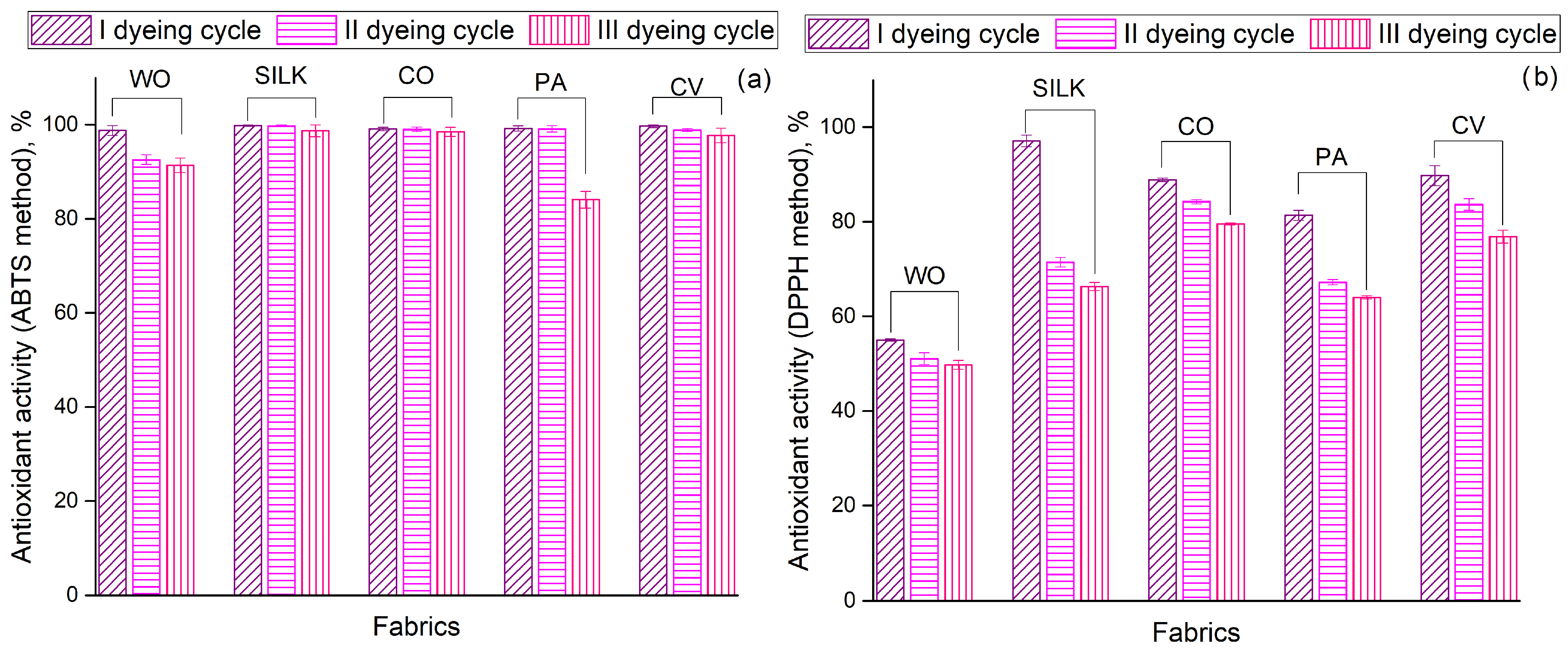 | Fabric | I Dyeing Cycle | II Dyeing Cycle | III Dyeing Cycle | |||