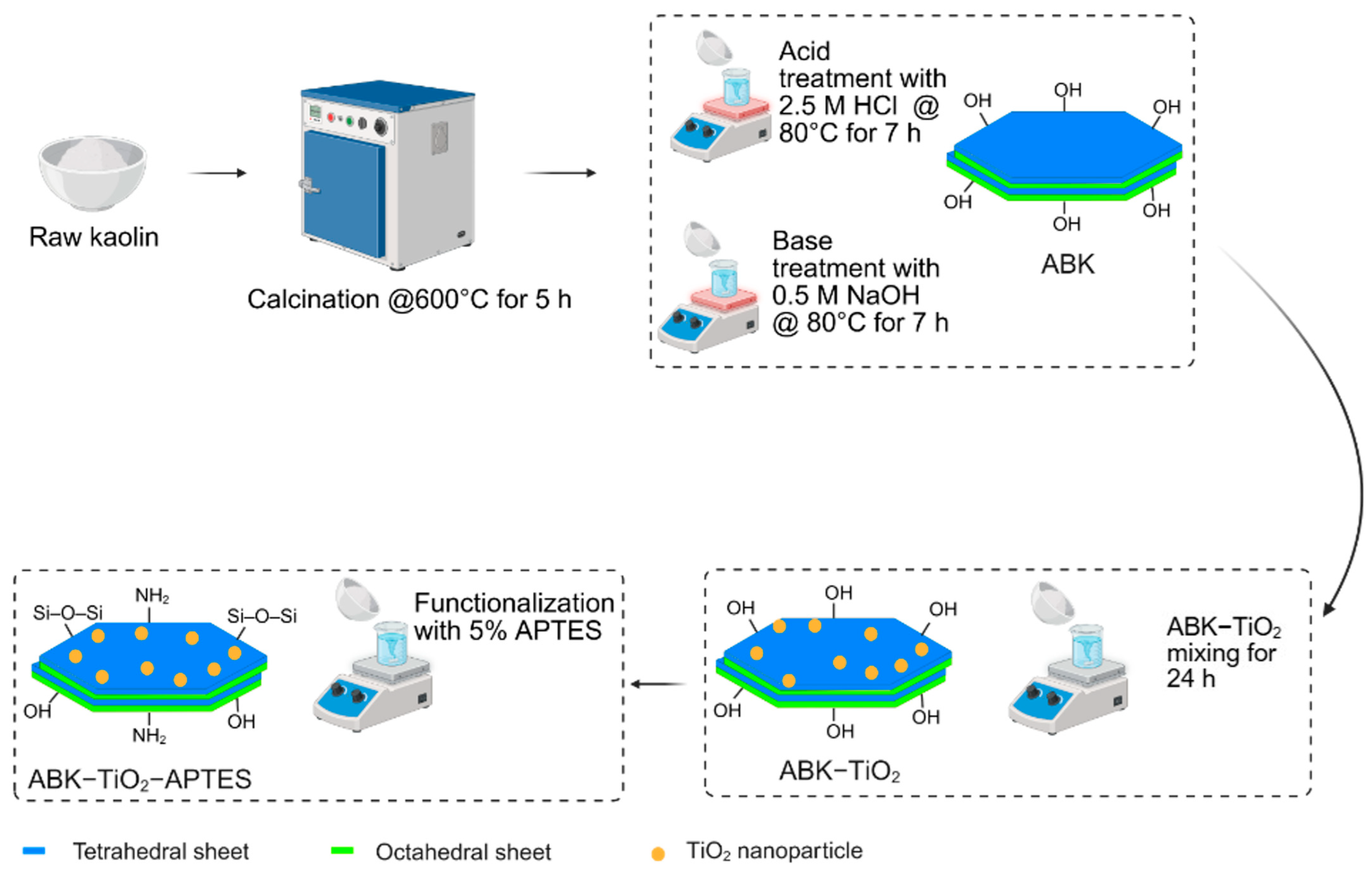- Karunadasa, K.S.P.; Wijekoon, A.S.K.; Manoratne, C.H. TiO2-Kaolinite Composite Photocatalyst for Industrial Organic Waste Decontamination. Next Materials. 2024, 3, 100065. [Google Scholar] [CrossRef]