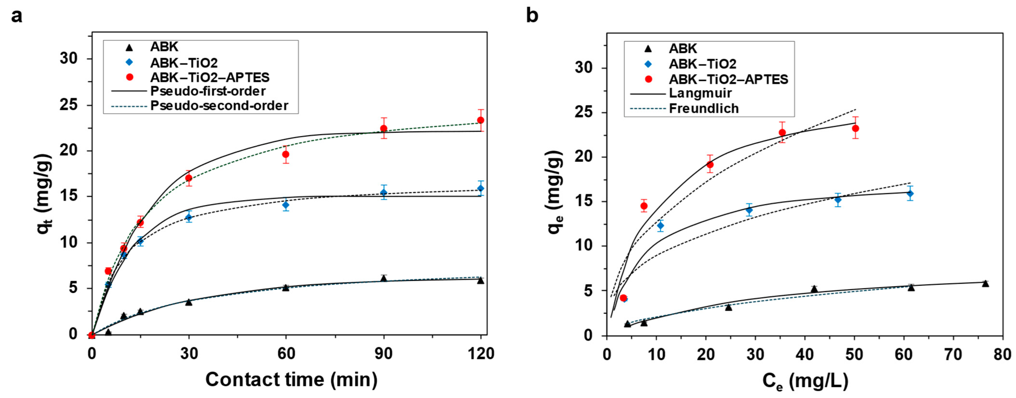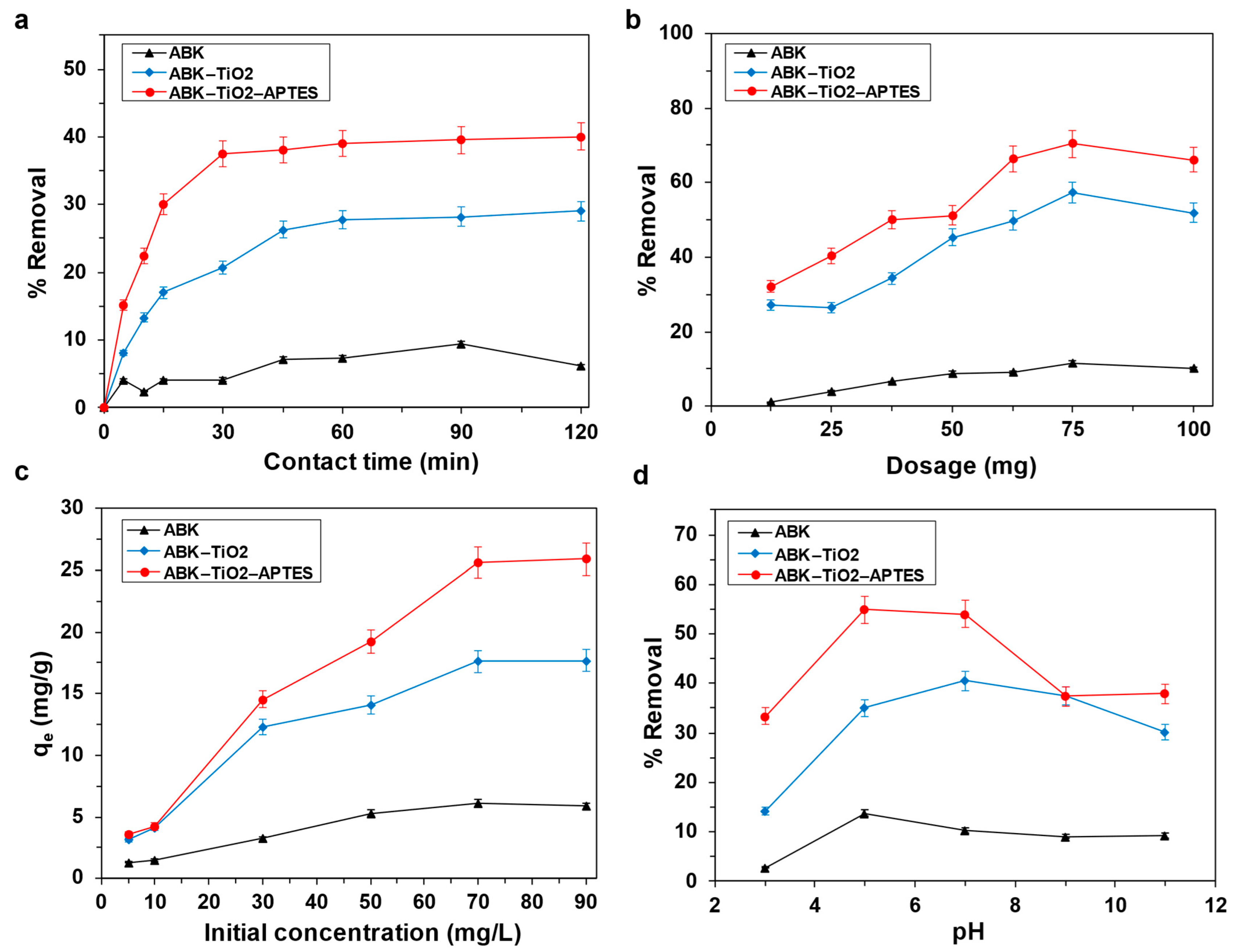 | ABK–TiO2–APTES | 49.81 | 22.43 | 0.74 | 22.88 | 1.60 | 1.55 | - | 2.22 |