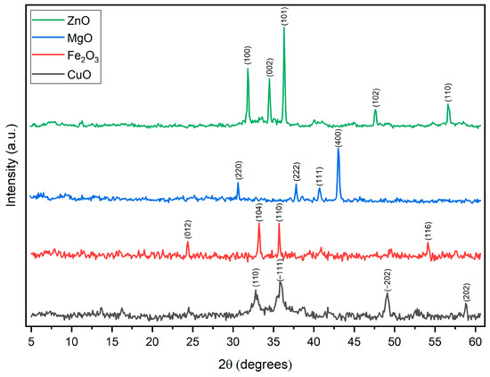 Overall, the four diffraction profiles exhibit: (i) peak positions and relative intensities in excellent agreement with the JCPDS standards for ZnO (zincite), MgO (periclase), Fe2O3 (hematite), and CuO (tenorite); (ii) the absence of secondary phases or unreacted precursors; and (iii) significant peak broadening consistent with nanoscale crystallite domains.