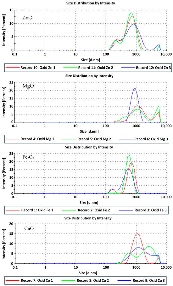 Particle size and size distribution of the oxide dispersions were measured using a Zetasizer Nano ZS—Red Badge system (Malvern, Worcestershire, UK) based on the Dynamic Light Scattering (DLS) technique. The instrument was calibrated for particle sizes ranging from 0.6 nm to 6 µm. This method correlates the particle size with the rate of Brownian motion, and the relationship between particle size and its diffusion rate is defined by the Stokes–Einstein equation [23,24].