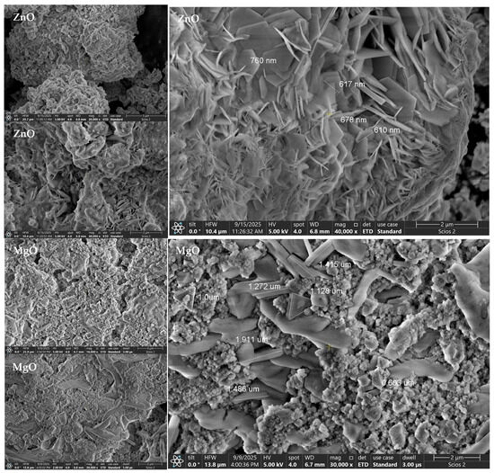 MgO shows rough, granular surfaces interspersed with plate-like fragments, indicative of periclase nanocrystallites that coalesce into compact secondary aggregates [48,49].