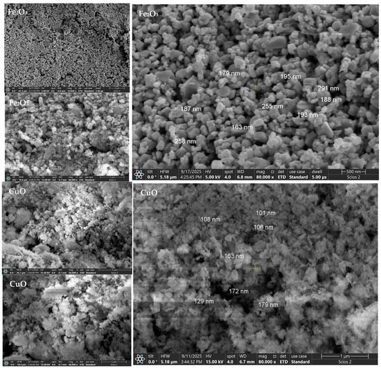 SEM observations provide direct evidence of the hierarchical organization of the synthesized metal oxide particles, consisting of nanoscale primary crystallites assembled into submicron or micron-sized secondary aggregates. In this context, the crystallite sizes estimated from XRD using the Scherrer equation should be regarded as apparent coherent domain sizes, which may underestimate the real mean crystallite dimensions by a factor of approximately 2–3, since instrumental broadening and microstrain contributions to the full width at half maximum (FWHM) of the diffraction peaks were not considered. Consequently, the grain sizes observed by SEM are more representative of the actual mean crystallite dimensions. From a classification perspective, crystallite or grain sizes in the range of approximately 100–300 nm are still conventionally considered within the nanomaterial domain, owing to the distinctive surface-related and physicochemical properties exhibited by powders in this size regime, despite their proximity to the submicrometer scale.