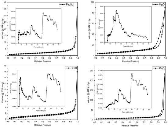 Due to the very low porosity and the absence of significant capillary condensation, a reliable mean pore size could not be determined for Fe2O3 and ZnO powders. Accordingly, quantitative BET/BJH parameters are reported only where meaningful, as follows: MgO (specific surface area 17.93 m2 g−1; pore volume 0.111 cm3 g−1; modal pore width ≈ 21.4 nm) and CuO (20.47 m2 g−1; pore volume 0.223 cm3 g−1; modal pore width ≈ 50.7 nm), while ZnO (2.33 m2 g−1) and α-Fe2O3 (4.30 m2 g−1) are characterized by very low surface areas and lack well-defined mesoporosity.