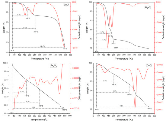 TGA–DTG curves of the synthesized nanocrystalline metal oxides (ZnO, MgO, α-Fe2O3, and CuO).