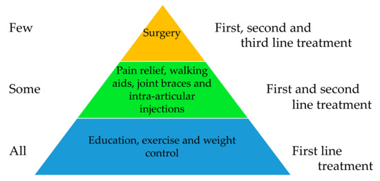Despite the heavy burden of OA on individuals, families, and healthcare systems, there are currently no disease-modifying OA-specific treatments authorized for clinical use [46]. According to the experts and the treatment guidelines that have been published recently, Everyone should receive education teaching them to be active, exercise and manage their weight. Some individuals may benefit from anti-inflammatory drugs or interarticular injections and a few need surgery (Figure 1). However, as the aging population expands and the number of people with OA rises across the world, the number of individuals that require surgery and joint replacement is likely to rise. Inevitably, this will place increased pressure on the need for orthopedic surgery and the cost to individuals and payers, including healthcare systems and insurance companies.