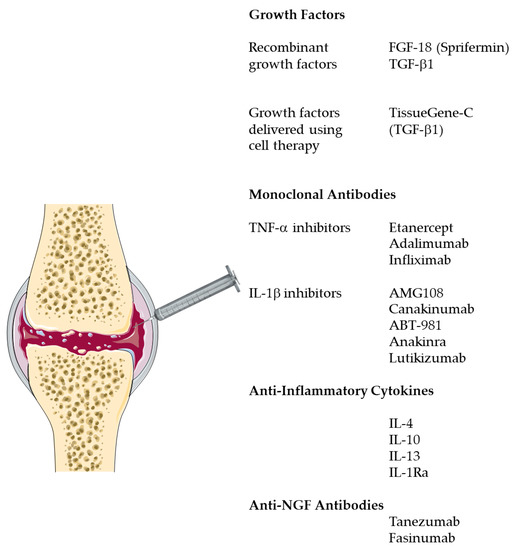 Biological intra-articular treatments for OA include growth factors, humanized monoclonal antibodies (mAbs), anti-inflammatory cytokines and cytokine receptor blockers, cell and gene therapy that results in over-expression of growth factors or blocks cytokine receptors or stimulates chondrogenic gene expression. Biological intra-articular therapies also include mAbs that inhibit nerve growth factor (NGF) and interfere with NGF signaling.
