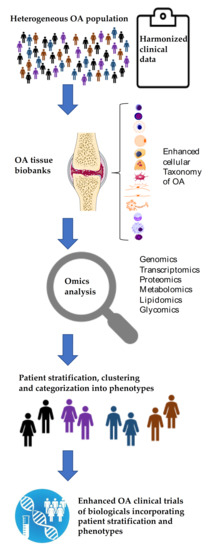 The field of rheumatology received a massive boost from basic research conducted in the field of oncology following the introduction of inhibitors of tumor necrosis factor α (TNF-α) for the treatment of a range of rheumatological conditions, beginning with RA [123,124,125]. OA is not the same as RA but the two diseases share some important characteristics. At the present time, OA remains highly problematic as a disease entity. Existing drugs only address symptoms of OA and there are no approved DMOADs [126,127]. OA drug development is hampered by the lack of sensitive outcome measures and there are only a handful of biomarkers that can be used to test the efficacy of new drugs [128].There are at present no early biomarkers of early OA [129,130]. Several Phase II OA clinical trials have recently failed but the therapeutic pipeline contains several promising biological candidates and it is hoped that a few symptoms modifying drugs may be approved within the next 3 to 5 years. Many future OA treatments are likely to be biological and developed for intra-articular delivery. However, we will need better biomarkers to assess the efficacy of these treatments and develop intra-articular biological treatments that are targeted to intra-articular phenotypes of OA (i.e., articular cartilage, synovitis and sub-chondral bone phenotypes). At the present time, we do not possess the tools for phenotyping and stratification of heterogeneous OA cohorts. However, as we develop these tools using deep phenotyping and multi-omics-driven approaches, we will be closer to achieving patient stratification for more effective targeting of biological drugs (Figure 4).