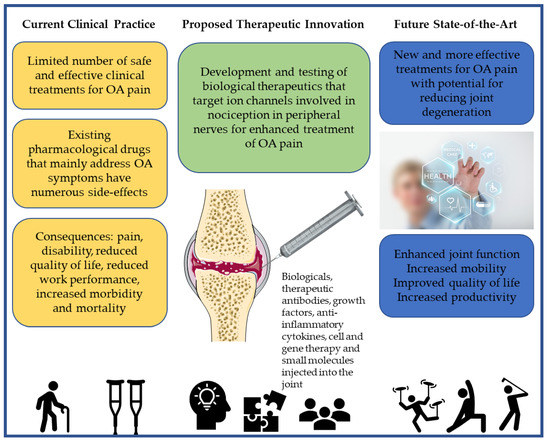 The expanding collection of therapeutic mAbs represent a rapidly growing class of biological drugs [96]. Whether mAbs are injected locally or delivered systemically, they are becoming an important arsenal in precision medicine and targeted cancer therapy [97,98,99]. Many of the recently developed therapeutic mAbs have high specificity and affinity for their target antigen, which is often present on the cell surface [96]. This is why it is crucially important to learn more about the surfaceome and membranome of chondrocytes and other cell types within the synovial joint, which has been an active area of research in our laboratory for the last few years [100,101]. The establishment of a comprehensive surfaceome and membranome for chondrocytes and other synovial joint cells may combine multi-omics approaches with conventional by chemical, immunological, cellular and in silico techniques [102]. An important sub-component of the surfaceome and membranome is the channelome, which is the complete set of ion channels and porins expressed in a cell [103]. Ion channels are a large family of transmembrane proteins that control ion transport across the cell membrane. They are actively involved in almost all cell biological processes in both health and disease and are widely considered as prospective therapeutic targets in many cardiovascular, respiratory, musculoskeletal and neurological diseases [104,105,106,107,108,109,110,111]. The channelome has been partially been defined in chondrocytes using a combination of proteomic and electrophysiological approaches [112,113,114,115]. However, thus far, no antibody-based drug targeting ion channel has been developed for clinical use [116,117]. Despite this limitation, there is huge potential for new research and development in this area. The technologies for designing and producing antibodies have become increasingly streamlined, scalable, simplified, practical and affordable. We need to focus on identifying pain targets and developing mAbs against them. We must also take advantage of the technological advances in protein and antibody engineering, cell and gene therapy, biomaterials and nanotechnology [118,119,120,121,122] and innovate in this area to develop new diagnostics and therapeutics for the benefit of people with OA and other forms of arthritis.