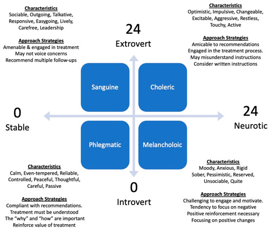 The phlegmatic characteristics include being calm, passive, peaceful, thoughtful, and reliable. These patients have a tendency to follow instructions and are compliant with recommendations. However, they also tend to be thoughtful and therefore, treatment approaches must be understood by the patient. The “why” and “how” of treatment approaches become particularly important for patients classified with a phlegmatic type of personality. Clinicians are encouraged to spend more time with these patients to ensure that they understand the value and purpose of the recommended treatment approach.