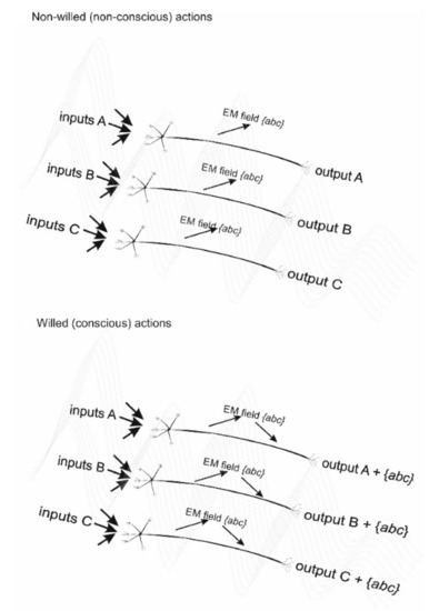 A key aspect of the cemi field theory, which is not shared by all EM field theories of consciousness, is that it provides a physical mechanism for the action of what we call “free will”: the initiation of voluntary behaviour. The basic idea is summarized in Figure 1, which shows three hypothetical firing neurons, A, B and C each with several inputs and a single output that will eventually (via several downstream neurons) initiate a motor output. Also represented, as wavy lines in the figure, is the EM field generated by neuron firing. In the top panel A is represented the situation for neurons engaged in non-conscious actions, such as directing the precise motion of lips and tongue to generate words. Each neuron acts independently to generate an output based on information processing of its several inputs. Each neuron’s output is independent and none is influenced by the EM field generated by their firing.