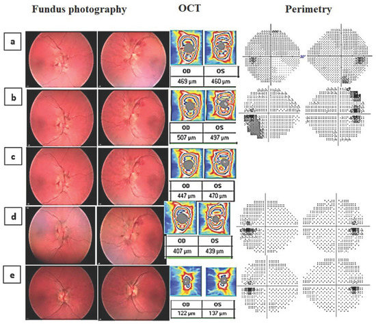 Digital fundus photography (left) with corresponding OCT thickness map (center) and perimetry (right) showing changes in papilledema, retinal nerve fiber layer (RNFL) thickness, as well as visual field before and after LP followed by medical therapy. Fundus photography showed severe papilledema in both eyes with hemorrhages in (a–d) (Frisén grade 4–5), which were in regression to grade 2 in e. OCT, on the other hand, quantified and discriminated subtle changes of papilledema severity, which were associated with changes of visual field (a,b,d,e). RNFL thickness map is coded by red and yellow colors indicating thickness values.