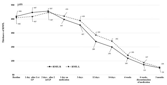 Rebound RNFL thickening (µm) after LP reversed by medication under monitoring of OCT. RNFL thickness in both eyes was significantly thickened 1 day after first LP, and 2 days after second LP. RNFL thickness was remarkably reduced on days 1, 3, 12, and 14 and on week 4 during medical therapy. RNFL thickness was almost normalized on week 6 when the medication was discontinued. RNFL thickness was normal at three-month follow-up.