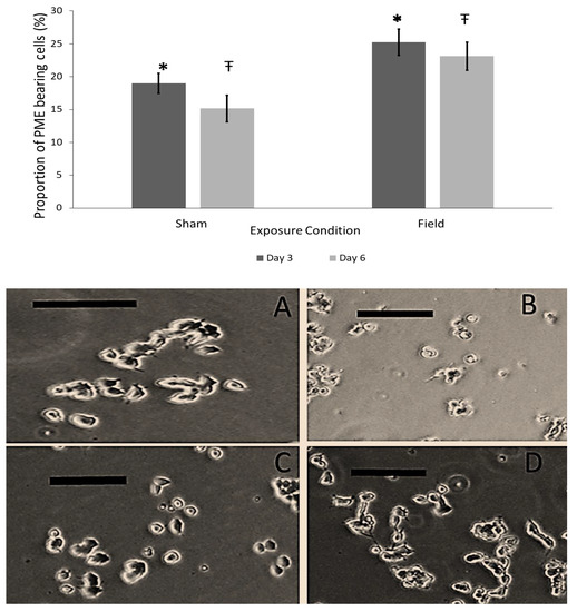 PC12 cells were exposed to the Burst-firing EMF pattern (PD = 3 msec, ISI = 3 msec; peak intensity 40 mG) generated by the 4-D application geometry with 2-Hz spatial rotation across all three axes, treated with 0.5 μM of forskolin and the proportion of PME-bearing cells determined. Sham treatments serve as the control condition (forskolin only). The graph (upper panel) represents the proportion of PC12 cells bearing PME following the 1-h Burst-firing EMF or Sham exposures. Error bars represent SEM. * and Ŧ indicate significant differences between conditions (p < 0.05). Supporting photos show representative samples comparing 1 h exposures to the Sham condition measured (A) 3 days and (B) 6 days after exposure and 1 h exposures to Burst-firing EMF measured (C) 3 days and (D) 6 days after exposure. Dark bars were fitted to original photos prior to their magnification and adjustment. Darkened bars measure approximately 100 um in length for each individual photo. For each condition there were 2 plates conducted in parallel, 4 sample photos assessed per plate, and all trials were repeated in triplicate.