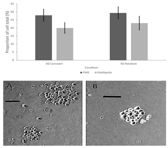 PC12 cells were exposed to Burst-firing EMF in the 4-D box as a function of spatio-temporal pattern of presentation (constant versus rotated) and the proportion of PME determined and compared. The graph (upper panel) demonstrates differences in the proportion of PME (dark bar) and multipolar extensions (light bar) across EMF exposure conditions. Error bars in the graph represent SEM. For each condition (constant and rotation), each trial was conducted in triplicate, 2 plates were conducted in parallel, and 4 samples per plate were photographed for cell counts in each condition. Both the constant and rotated exposures were conducted on PC12 cells that were treated with 0.5 μM of forskolin. Supporting photos show representative images of cells exposed to the constant (A; left) and rotated (B; right) 1 h, Burst-firing EMF. Darkened bars were fitted to original photos prior to their adjustment. Each darkened bar approximates 100 um in length for the individual photo for which they have been fitted.