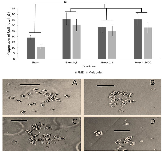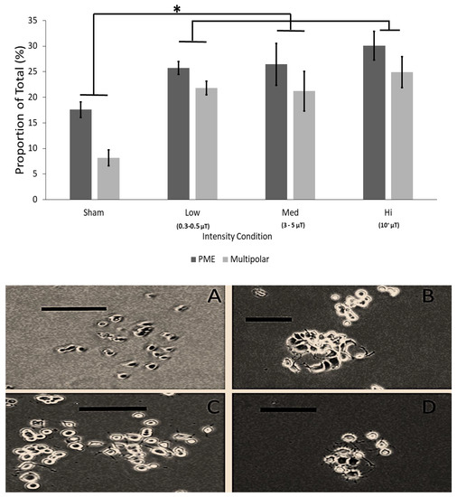 The graph (upper panel) shows the differences in the proportion of PME-bearing (dark bar) and multipolar extensions (light bar) of PC12 cells treated with the combination of 0.5 µM of forskolin and exposed to 1-h Burst-firing EMF of different intensities. Error bars represent SEM. Sham conditions were replicated 6 times and all other conditions were replicated in triplicate. For each replication, 2 plates were exposed in parallel and 4 sample photos were taken from each plate for cell counting. * indicates significant differences between groups (p < 0.05). The photo shows representative images of PC12 cells exposed for 1 h to: (A). Sham conditions; (B), low intensity (0.3–0.5 µT); (C), medium intensity (3–5 µT); and, (D), high intensity (10+ µT) Burst-firing EMF. Darkened bars were fitted to original microscope photos and adjusted for clarity. Individual darkened bars approximate 100 um in length. Recall that sham treatments are PC12 cells treated with forskolin only (control), while all EMF exposures were treatments where cells received both forskolin treatment and EMF.