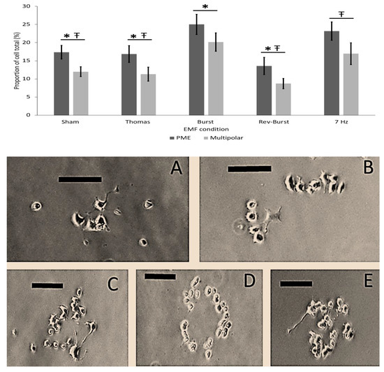 The graph (upper panel) shows differences in morphology between PC12 cells treated with 0.5 µM forskolin and exposed to different patterned EMF with PD and ISI set to 3 msec and verified intensity within 2–4 µT for 1 h. The proportion of cell total for plasma membrane extensions (PME) are represented in the dark bars, whilst the proportion of the multipolar cells are represented in the light bars. Error bars correspond to SEMs. For each exposure condition, 2 plates were conducted in parallel for a given replicate, 4 sample photos were taken from each plate for cell counting, and all conditions were replicated 3 times. * and Ŧ identify significant differences between experimental groups (p < 0.05). The photo shows representative images from PC12 cells exposed to: (A), Sham conditions; (B), Thomas-EMF; (C), Burst-firing EMF; (D), Reverse burst-firing EMF; and, (E), 7-Hz pulse EMF. Darkened bars were fitted to original microscope photos and adjusted for clarity. Individual darkened bars approximate 100 um in length. As noted previously, sham treatments are PC12 cells treated with forskolin only (control), while all EMF exposures were treatments where cells received both forskolin treatment and EMF.