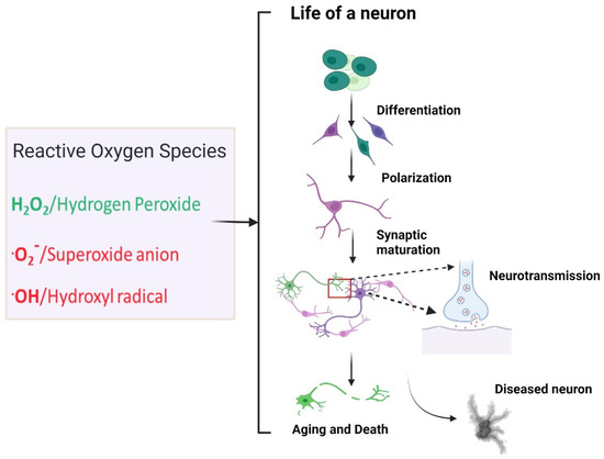 Influence of reactive oxygen species in the life of a neuron. Under normal conditions, the diffusible nonradical ROS, hydrogen peroxide, is synthesized physiologically and is a key regulator of processes fundamental to neuronal development and function, including neuronal differentiation, polarization, synaptic maturation, neuropeptide secretion, and neurotransmitter receptor transport. On the other hand, uncontrolled ROS production by damaged mitochondria, especially of superoxide and hydroxyl radicals, are potentially detrimental. Uncontrolled ROS may damage neurons, promote neuronal decline, and exacerbate neurodegenerative pathology. Created with BioRender.com (accessed on 17 February 2022).