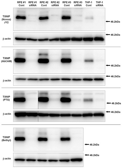 Cell extracts from retinal pigment epithelial cell line ARPE-19 (RPE) and THP-1 derived macrophages transfected with siRNA for TXNIP or non-specific control were used to demonstrate TXNIP antibody specificity by immunoblot. These samples were used in a recent publication [21]. The exact preparation of TXNIP siRNA transfected extracts is described in detail in this publication [21].