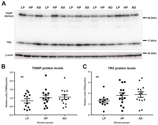 We carried out immunoblot analyses to measure the relative levels of TXNIP and TRX in LP, HP, and AD MTG brain protein extracts. Due to the large size difference of these proteins, these could be measured simultaneously on the same membrane using an optimized mixture of antibodies. We employed the rabbit polyclonal antibody to TXNIP (Bethyl) or the rabbit monoclonal antibody to TXNIP (Abcam) rather than the Novus monoclonal, as they provided significantly stronger signals. Preliminary experiments had demonstrated that the brain immunoblots had required detection times of 10–15 min to identify measurable bands using the Novus antibody (1:100 dilution), while the other TXNIP antibodies required detection times of approximately 30–60 s under the same conditions. A representative image of TXNIP and TRX polypeptides in selected human samples detected with rabbit polyclonal antibody (Bethyl) are shown in Figure 3A. This was one of the three blots analyzed. Similar results were obtained using the TXNIP rabbit monoclonal antibody (Abcam, data not shown). We did not detect significant differences between the LP, HP, and AD groups for TXNIP or TRX by one-way analysis of variance (Figure 3B or Figure 3C).