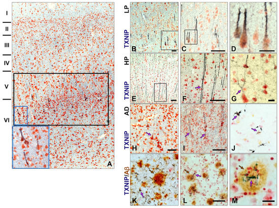 Distribution of TXNIP immunoreactive structures in middle temporal gyrus of LP, HP, and AD cases and in relation to Aβ plaques. (A) Low-magnification image of LP case showing selective distribution of TXNIP immunoreactive structures (purple) primarily in layer V and VI (black outline). High magnification inset showing layer VI cell structure (blue outline). (B–D) Progressively increasing magnification of TXNIP immunoreactive structures (purple) in a low-plaque (LP) case. (E–G) Different structures showing TXNIP immunoreactivity in high-plaque (HP) cases. (H–M) TXNIP immunoreactive structures in AD cases. (H–I). Weaker TXNIP staining of neuronal structures in AD cases. (J) Identification of microglia-like TXNIP immunoreactive cells (purple arrow). (K–M) Identification of microglia-like TXNIP immunoreactive cells (purple arrow) associated with Aβ plaques (brown arrow) in AD cases. TXNIP immunoreactivity is shown in purple color. Aβ immunoreactivity is shown in brown. Abbreviations: LP, low plaque; HP, high plaque; AD, Alzheimer’s disease. Bars represent 50 μm.