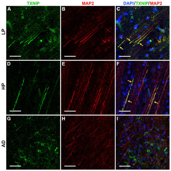 Confocal microscopy showing extensive colocalization of TXNIP with MAP2 immunoreactivity. All sections shown were from middle temporal gyrus. (A–C) LP case showing (A) TXNIP immunoreactivity (green), (B) MAP2 immunoreactivity (red), and (C) merged image (yellow arrows) with DAPI staining (blue). (D–F) HP case showing (D) TXNIP immunoreactivity (green), (E) MAP2 immunoreactivity (red), and (F) merged image, indicated by yellow arrows with DAPI staining (blue). (G–I). AD case showing (G) TXNIP immunoreactivity (green), (H) MAP2 immunoreactivity (red), and (I) merged image showing TXNIP-positive cells with limited colocalization with MAP2 with DAPI staining (blue). Bars represents 30 μm.