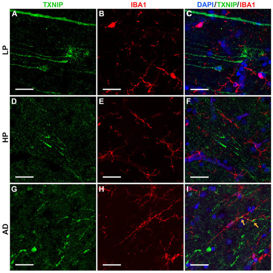 Confocal microscopy showing limited colocalization of TXNIP with microglia marker IBA-1 immunoreactivity. All sections shown were from middle temporal gyrus. (A–C) LP case showing (A) TXNIP immunoreactivity (green), (B) IBA-1 immunoreactivity (red), and (C) merged image with DAPI staining (blue). (D–F) HP case showing (D) TXNIP immunoreactivity (green), (E) IBA-1 immunoreactivity (red), and (F) merged image with DAPI staining (blue). (G–I) AD case showing (G) TXNIP immunoreactivity (green), (H) IBA-1 immunoreactivity (red), and (I) merged image showing TXNIP-positive cells (green) with limited punctate intracellular colocalization (yellow arrow) with IBA-1 (red arrow) with DAPI staining (blue). Bars represents 30 μm.