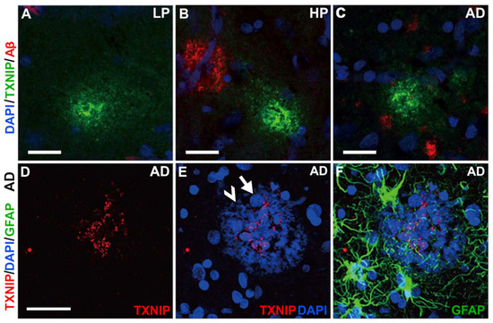 Figure 9A–C shows that plaque-like accumulations of TXNIP were present in sections from all disease groups. These structures referred to in Figure 5B are distinct from Aβ immunoreactive plaques (red in panels B and C). In Figure 9D,E of an AD case, the TXNIP-positive structure (red) colocalized with a plaque-like structure. This was revealed using DAPI staining that not only recognized accumulations of nuclei as expected (white arrows) but also appeared to bind to highly aggregated amyloid plaque (white arrowheads) [28]. The TXNIP-positive structures did not colocalize with GFAP-positive astrocytes around the plaques.