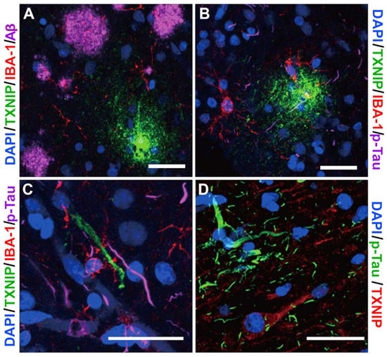 Interactions of TXNIP with pathological features in middle temporal gyrus (A–C). Triple staining demonstrating TXNIP (green), IBA-1 (red), and Aβ (A, purple) or p-Tau (B–C, purple). (D) Absence of colocalization of p-Tau (green) and TXNIP (red). Bars represent 30 μm.