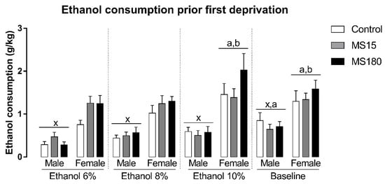 Ethanol intake before deprivations in female and male rats exposed to brief and prolonged maternal separation. Bars represent the mean ± SEM (n = 11–14 animals/group). Each concentration represents the average intake of the 4 days of exposition in each experimental phase of the procedure. x; p < 0.05 when compared to female groups of the same experimental phase, independent of manipulation; a, p < 0.05 when compared to the ETOH 6% phase of the same sex, independent of manipulation; b, p < 0.05 when compared to ETOH 8% phase of the same sex, independent of manipulation; c, p < 0.05 when compared to ETOH 10% phase of the same sex, independent of manipulation. ETOH, ethanol; MS15, brief maternal separation; MS180, prolonged maternal separation.