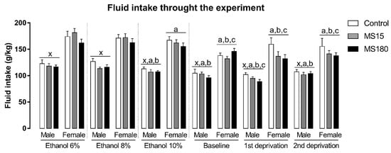 Fluid intake through the experiment in female and male rats exposed to brief and prolonged maternal separation. Bars represent the mean ± SEM (n = 11–14 animals/group). Each concentration represents the average intake of the 4 days of exposition in each experimental phase of the procedure. x; p < 0.05 when compared to female groups, independent of the manipulation or experimental phase; a, p < 0.05 when compared to the ETOH 6% phase, independent of sex or manipulation; b, p < 0.05 when compared to ETOH 8% phase, independent of sex or manipulation; c, p < 0.05 when compared to ETOH 10% phase, independent of sex or manipulation. ETOH, ethanol; MS15, brief maternal separation; MS180, prolonged maternal separation.