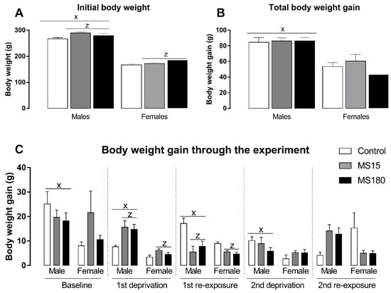 Initial body weight and body weight gain through the experiment in female and male rats exposed to brief and prolonged maternal separation. Bars represent the mean ± SEM (n = 11–14 animals/group). (A), initial body weight (g). (B), body weight gain during the whole period of alcohol deprivation effect (g/kg). (C), body weight gain in different phases of the alcohol deprivation effect protocol (g/kg). Body weight gain was calculated as the difference between the body weight on the last day of the respective phase and the first day of the same experimental phase. x; p < 0.05 when compared to female groups, independent of the manipulation; z, significant effect of maternal separation, regardless of sex. MS15, brief maternal separation; MS180, prolonged maternal separation.
