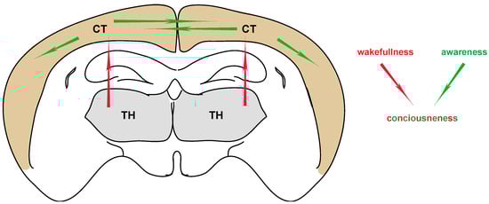 - Redinbaugh, M.J.; Phillips, J.M.; Kambi, N.A.; Mohanta, S.; Andryk, S.; Dooley, G.L.; Afrasiabi, M.; Raz, A.; Saalmann, Y.B. Thalamus Modulates Consciousness via Layer-Specific Control of Cortex. Neuron 2020, 106, 66–75. [Google Scholar] [CrossRef] [PubMed]