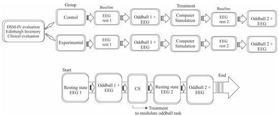 The experiment happened in a room with controlled lighting and temperature and with electrical and sound insulation. The control and experimental groups sat down on a chair with armrests to minimize any muscular artifact during EEG signal acquisition. EEG data were collected before, during, and after the oddball task. All procedures were the same for both groups.