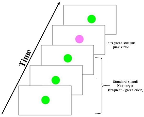 The temporal sequence of the oddball visual task. The green-colored circle stimulus is the “frequent” or “standard” stimulus. The pink-colored circle is the “rare” or “deviant” or “target” stimulus. The number of standards presented between two deviants is pseudo-random [40].