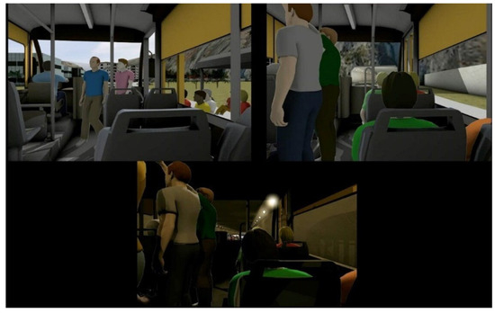 Previous studies confirmed that the simulation is a useful method to induce anxiety [9,37]. It was a 4 min, three-dimensional computer animation developed by TriptyqueLAB (www.triptyquelab.com accessed on 19 March 2022) (Figure 3). The computer simulation for 4 min consisted of 30 s of white screen, followed by 3 min of anxiogenic situations, and then more 30 s of a white screen. The animation was in a first-person perspective and started at a bus stop, and the bus arrives. The subject boards and sits on the bus, the bus moves through city streets, stops again. The bus fills with people, moves through the streets, enters a tunnel, stops inside the tunnel due to traffic, starts moving again, leaves the tunnel, and stops at a bus stop. The subject leaves the bus and watches the bus drive away [37,41]. The simulation included sounds related to the context of the images. The subjects were exposed to computer simulation just once.