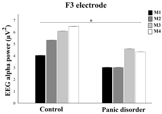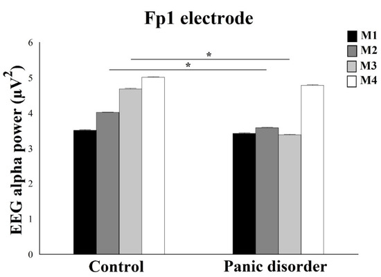 This present study investigated the EEG alpha power over the frontal cortex and reaction time in PD patients versus healthy controls during the oddball task before presenting a computer simulation that triggers anxiety symptoms. Our main result indicated a decreased alpha power in PD patients, however demonstrated an increase in EEG alpha power after the computer simulation in both groups, except for the Fp1 electrode during M3 moment in the experimental group. According to previous studies, this result reported a low EEG alpha power in PD patients [9,32,33,34,48,49]. Previous studies demonstrated a greater EEG alpha power for healthy subjects was found when compared to the PD patients in the frontal area. The greater frontal activation could be related to an impaired frontal attempt to regulate downstream excitability or reflect the excitation from deeper subcortical regions [9].