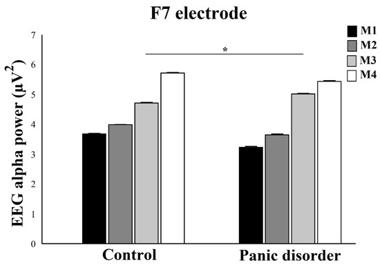 A two-way mixed ANOVA evidenced interaction between Group and Moments for F7 electrode (F(4) = 7.11; p = 0.0006; ƞ2p = 0.58; power = 99%) (Figure 6). When analyzing the interaction by One-way ANOVA within each group, results showed a difference for control, with (F(2) = 8.73; p = 0.0001; ƞ2p = 0.50; power = 100%). The Scheffé post hoc showed a difference between M4 and M1 and between M4 and M2 (p = 0.001). We observed that the M4 produced an increase in EEG alpha power compared to M1 and M2. In addition, the experiment showed a statistical difference, with (F(2) = 10.05; p = 0.0002; ƞ2p = 0.54; power = 99%). The Scheffé post hoc reveals a difference between M4 and M1 and between M4 and M2 (p = 0.001). M4 had greater EEG alpha power when compared to M1 and M3. The analysis between groups by independent t-test, for EEG alpha power under F3 electrode, only showed differences for M3, with (t(2) = 9.05; p = 0.001; d = 0.51), with an increase EEG alpha power after computer simulation.