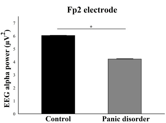 Main effect for group (p = 0.002). The EEG alpha power for Fp2 electrode decreases in the experimental group compared to the control group. The result is represented by the mean ± standard error and the statistically significant difference is indicated with *, p < 0.05.