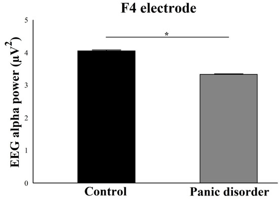 Main effect for group (p = 0.001). The EEG alpha power for F4 electrode decreases in the experimental group compared to the control group. The result is represented by the mean ± standard error and the statistically significant difference is indicated with *, p < 0.05.