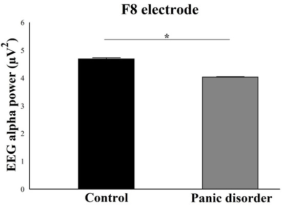 Main effect for group (p = 0.001). The EEG alpha power for F8 electrode decreases in the experimental group compared to the control group. The result is represented by the mean ± standard error and the statistically significant difference is indicated with *, p < 0.05).